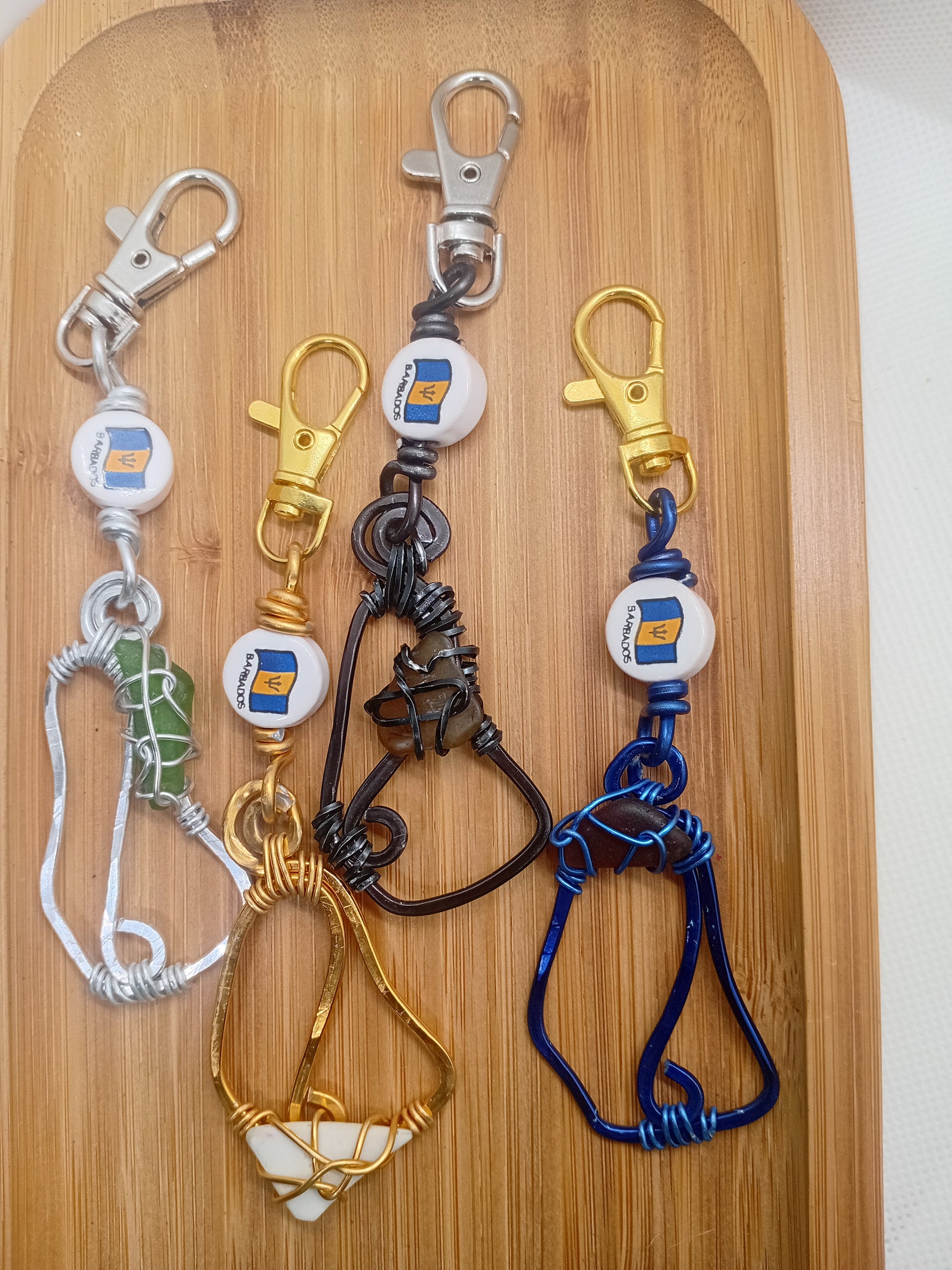 Experience the beauty of Barbados wherever you go with our Sea Glass Barbados Map key chains. Each piece is s hammered with care and features a unique wire-wrapped design representing one of our eleven parishes or four stunning coastlines. Available in gold, silver blue or black aluminum with a porcelain Barbados flag bead. Thes are perfect gift for you and a friend or two.