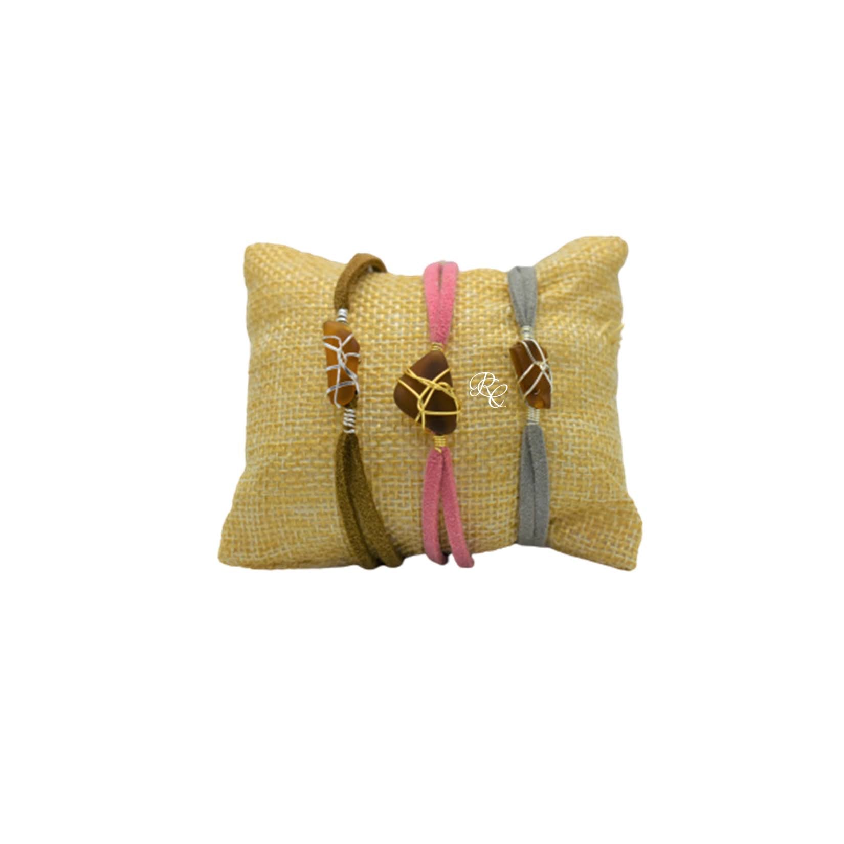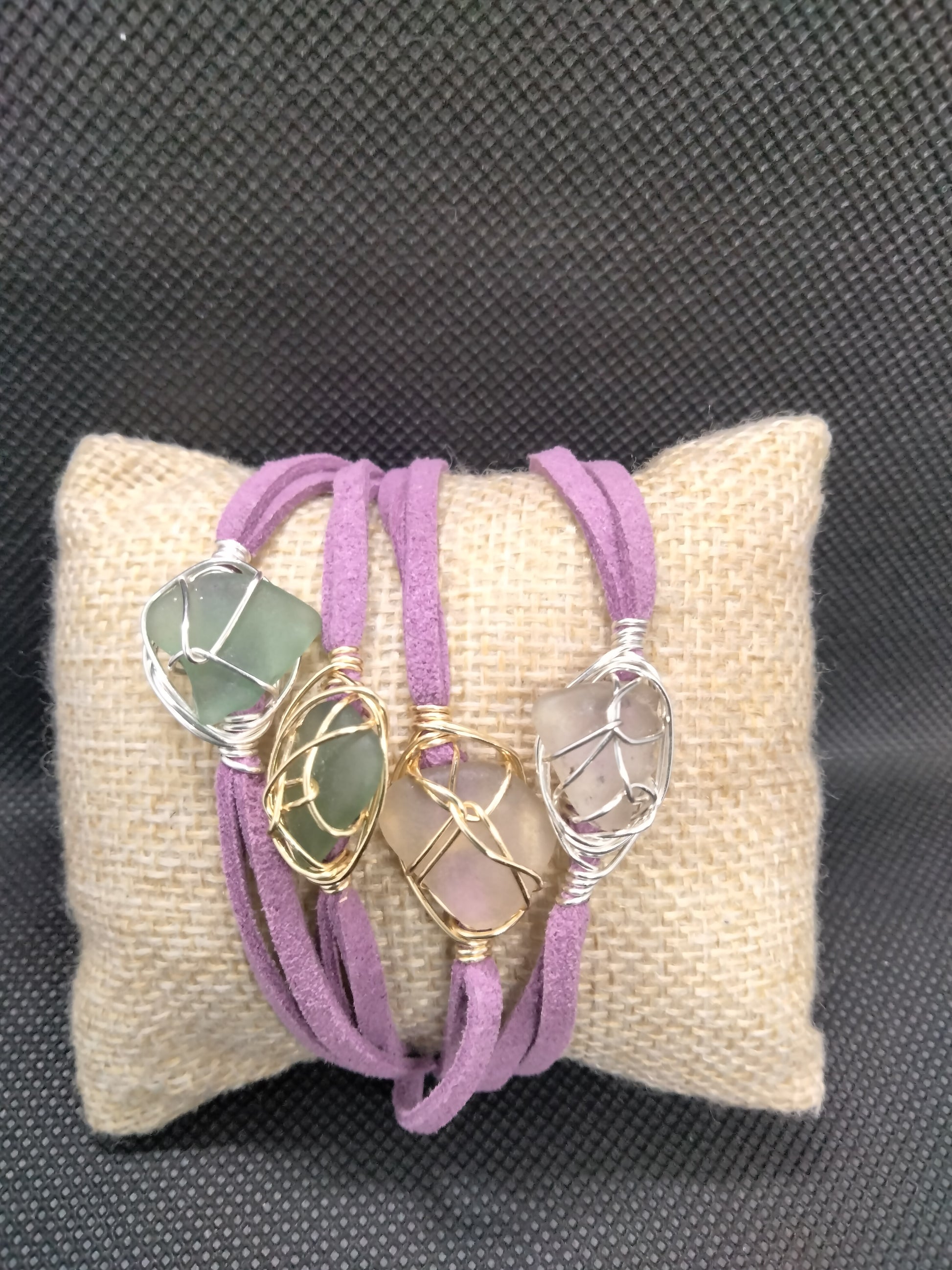 Expertly crafted using Sea glass sourced from the pristine beaches of Barbados, this handmade bracelet is adorned with silver-plated or gold-plated wires and secured with stainless steel closures. Choose from a range of suede colors, including black, pink, dark blue, emerald green, turquoise, nude, purple and brown. Sea glass available in shades of white , brown and green.